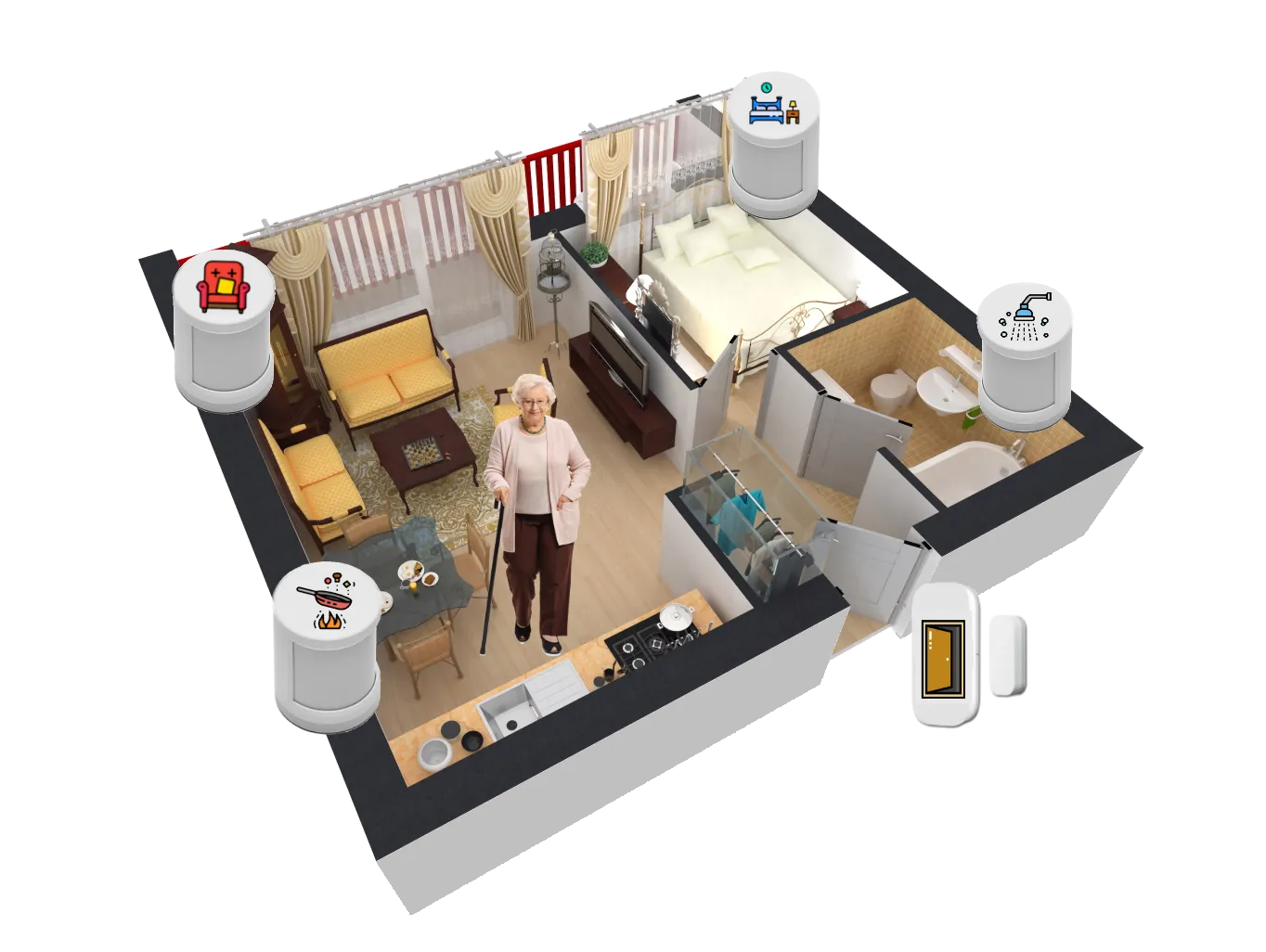 Instalan en el hogar un kit sencillo sin cables con sensores en puntos clave (baño, salón, cocina, dormitorio y puerta principal). Estos sensores registran actividad y la app analiza la rutina en tiempo real para enviarte notificaciones instantáneas. La persona mayor no tiene que llevar nada encima ni cambiar sus hábitos.